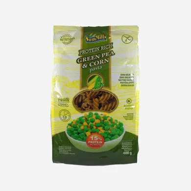 Sam mills Bezlepkové kukuričné cestoviny – Fusilli zo zeleného hrachu 400 g. Výrobok je vhodný pre bezlepkovú diétu. Neobsahuje lepok, pšenicu, vajcia, mlieko, sóju ani cholesterol. Sam Mills sú zdravá alternatíva pšeničných cestovín. Majú nízky obsah tuku a vysoký obsah bielkovín. Cestoviny Sam Mills sú ľahko stráviteľné, ich príprava je rýchla a jednoduchá. Zloženie: 70% múka zo zeleného hrachu, 30% kukuričná múka Návod na prípravu: Priveďte vodu (odporúčaný pomer je 1 liter vody na 100 g cestovín) rýchlo k varu. Osoľte podľa chuti. Do vriacej vody vložte cestoviny a zamiešajte. Varte 7-9 minút v nezakrytom hrnci, počas varenia cestoviny niekoľkokrát zamiešajte. Uvarené cestoviny preceďte, dajú sa aj prepláchnuť horúcou vodou a môžete podávať.
