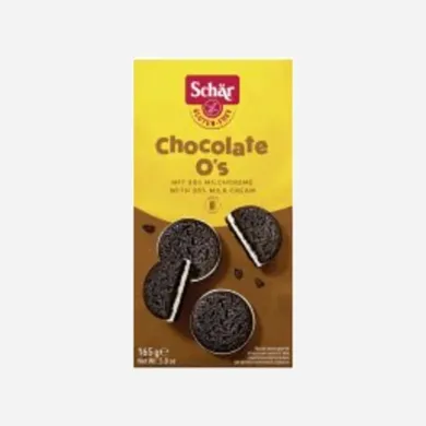 Schär Bezlepkové sušienky Chocolate O's 165 g. Kakaové bezlepkové sušienky Chocolate O's s mliečnou náplňou. Neobsahujú lepok, pšenicu, vajcia a konzervanty. Jednoducho zdravé a chutné maškrtenie. Zloženie: Mliečny krém 35% (kokosový tuk, palmový tuk), sušené plnotučné mlieko 6,5%, dextróza, cukor, laktóza (mlieko), emulgátor: sójový lecitín, prírodná aróma, kukuričný škrob, cukor, palmový tuk,, kakaový prášok so zníženým obsahom tuku 5 %, sójová múka, zemiaková múčka, sušené plnotučné mlieko, soľ, kypriace látky: uhličitany sodné a uhličitany amónne. Skladovanie: Skladujte v chladnom, temnom a tienistom mieste. Môže obsahovať stopy vlčieho bôbu.