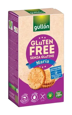 Gullón Glutén free MARIA sušienky 380 g. Bezlepkové sušienky, ktoré sú vhodné pre všetkých, ktorí chcú zdravo žiť a uctievajú zdravý životný štýl. Zdravá a rozumná desiata neobsahujúce lepok, orechy, laktózu ani vajcia, sú preto vhodné pre celiakov, alergikov i vegetariánov a vegánov. Spoločnosť GULLON bola založená v Španielsku v roku 1892 Manuelom Gullónem, ten s tímom niekoľkých ľudí a vďaka svojmu podnikateľskému prístupu, vytvoril produkt, ktorý bol v tom čase v španielskej spoločnosti neznámi. Sušienku, ktorá bola vytvorená v Anglicku na začiatku 19.storočia. Aj v ťažkých dobách sa jeho firme podarilo udržať svoju pozíciu a vyrásť v priebehu rokov v uznávanú spoločnosť. Dnes je Galletas Gullón svetovým lídrom v predaji sušienok bez cukru, bez lepku a bez laktózy a tiež je jedným z popredných európskych výrobcov sušienok a jednou z najväčších potravinárskych spoločností v Španielsku. Vďaka veľkej expanzii na zahraničné trhy, si na ich sortimentu zdravých pochúťok môžu pochutnať ľudia z celého sveta. Zloženie: kukuričná múka, 18% rastlinný olej (slnečnicový s vysokým obsahom mastných kyselín), cukor, kukuričný škrob, glukózový sirup a fruktózový kukuričný sirup, ryžová múka, sójová múka, kukuričná vláknina, vláknina z hrachu, kvasnice: hydrogénuhličitan sódy a amónny, soľ, emulgátor: sójový lecitín.