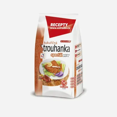 Extrudo Kukuričná strúhanka špeciál 200 g. Kukuričná strúhanka špeciál s paprikou je príjemne chrumkavá a prirodzene bezlepková. Je určená na obaľovanie a vyprážanie, zahusťovanie, varenie aj pečenie namiesto klasickej strúhanky. Strúhanka kukuričná chrumkavá spĺňa trendy moderného stravovania. Príjemne chrumká a v porovnaní s klasickou strúhankou nesaje toľko tukov. Bez lepku, nenasakuje tuk krehkosť a chrumkavosť obaľovaných surovín vyniká svojou zlatou farbou. Zloženie: kukurica 76,5%, cícer, paprikový extrakt 0,3% (rastlinný olej, farbivo E160c) jedlá soľ, rastlinný repkový olej. Extrudovaný výrobok.