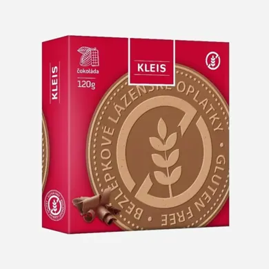 Kleis Kúpeľné oblátky čokoládové bez lepku 120 g. Bezlepkové kúpeľné oblátky sú vyrobené klasickým spôsobom a vynikajú svojou nezameniteľnou chuťou. Sú určené pre tých, čo nemôžu orechy alebo tie, čo milujú čokoládu. Zloženie: Bezlepková ryžová múka, tapioková múka, kukuričný škrob, zemiakový škrob, kukuričná múka, xantán (E415), cukor, nehydrogenovaný rastlinný tuk (palmový olej, bambucký olej, emulgátor sójový lecitín), sušené % cukru, kakaová hmota, kakaové maslo, mliečny tuk, sójový lecitín, polyglycerol-polyricín-oleát, vanilkový extrakt Bourbon Madagaskar) repkový olej, plnotučná sójová múka, kakaový prášok, vaječné žĺtky, aróma, jedlá hydrogénuhličitan sodný.