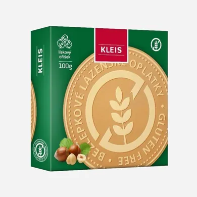 Kleis Kúpeľné oblátky orieškové bez lepku 100 g. Bezlepkové kúpeľné oblátky sú vyrobené klasickým spôsobom a vynikajú svojou nezameniteľnou chuťou rozomletých lieskových orieškov. S touto príchuťou žiadne iné bezlepkové oblátky nekúpite. Zloženie : Bezlepková ryžová múka, tapioková múka, kukuričný škrob, zemiakový škrob, kukuričná múka, xantán (E415), cukor, nehydrogenovaný rastlinný tuk (palmový olej, bambucký olej, emulgátor sójový lecitín), jadrá lieskových orechov 5,8%, sušené vaječné žĺtky, sušené odstredené mlieko, mletá škorica, aróma, jedlá soľ, kypriaca látka: hydrogénuhličitan sodný.