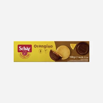 Schär Orangino bezlepkový 150 g. Jemné pečivo bez lepku s pomarančovou náplňou polomáčané v čokoláde. Špeciálne pripravená pre osoby s neznášanlivosťou lepku. Zloženie : Cukor, čokoláda 15 % (cukor, kakaová hmota, kakaový tuk, emulgátory: slnečnicový lecitín; E476; aróma), pitná voda, glukózo-fruktózový sirup, pasterovaná vaječná hmota, kukuričná múka, zemiakový škrob; sójová múka, pomarančová šťava z koncentrátu 2,6 %, maltodextrín, regulátory kyslosti: kyselina citrónová, E331; kypriace látky: hydrogénuhličitan amónny, difosforečnan sodný, hydrogénuhličitan sodný; želírujúca látka: pektín; koncentrovaná jablčná šťava, arómy, jedlá soľ, repkový olej, farbivo: annatto norbixin. Môže obsahovať stopy mlieka a škrupinových plodov.