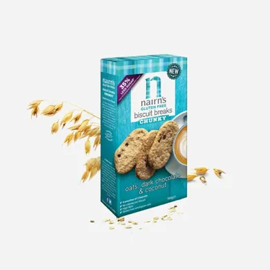 Nairns Ovsené sušienky s horkou čokoládou a kokosom bez lepku 160 g. Sušienky sú bez lepku a obsahujú menej cukru, než klasické sušienky a sú bohaté na vlákninu. Balené v jednotlivých balíčkoch po štyroch sušienkach, čím poskytujú ideálnu porciu zdravej desiaty, ktorú môžete mať kedykoľvek po ruke. Výborné aj v kombinácii s tvarohom či jogurtom. Zloženie: Celozrnné bezlepkové ovsené vločky (60%), udržateľný olej z palmového ovocia, kúsky horkej čokolády (10%) (cukor, kakaová hmota, kakaové maslo, emulgátor sójový lecitín, prírodná vanilková aróma, cukor Demerara, sušený kokos (5%), tapiokový škrob, čiastočne invertovaný rafinovaný sirup, Lyle 's zlatý sirup, kypriaci činidlá (hydrogénuhličitan sodný, hydrogénuhličitan amónny), prírodná aróma, morská soľ.