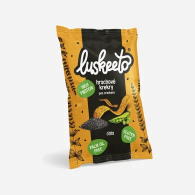 Strukovinové krekry s chia 40 g. Strukovinové krekry Luskeeto sú chrumkavá pochúťka zo strukovín, prirodzene bezlepková, plná proteínu a vlákniny. Použiť ju môžete aj ako chutnú desiatu na cestách alebo napríklad do polievky namiesto krutónov. Hlavnou zložkou je hrachová múka, ktorá krekrom dodáva vysoké výživové hodnoty. Sú bohaté na bielkoviny a vlákninu.